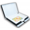 Accès facile pour permettre une utilisation sur un chevalet, avec une sangle sur le petit côté. Le carton de séparation intérieur permet de soulever des montages avec sangle facilement.